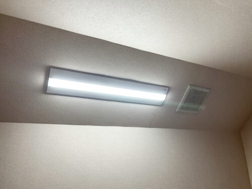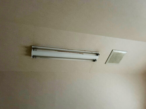 作業前の状態がこちらです。昔の公団住宅や古いアパートでよく見かけた、蛍光管がそのまま見えるタイプですね。カバーがないから掃除も大変だし、何より見た目が古臭い印象を与えてしまいます。