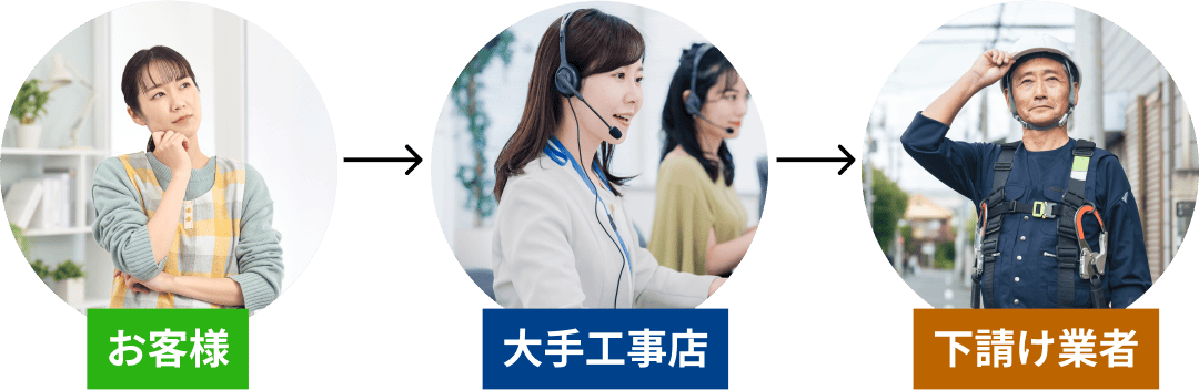 大手工事店やハウスメーカーでは、下請けの業者を使うケースがほとんどで、当然中間マージンが発生するので、コスト的にも高くなります。